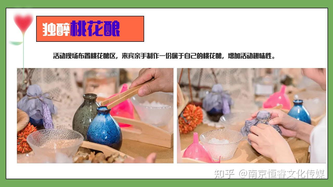 獨(dú)醉桃花釀:活動(dòng)現(xiàn)場布置桃花釀區(qū),來賓可以親手制作屬于自己的桃花釀。桃花的芬芳融入美酒之中,光是想想就很美好。在制作過程中,大家既能體驗(yàn)到動(dòng)手的樂趣,又能感受傳統(tǒng)文化的魅力,最后還能收獲一瓶獨(dú)一無二的桃花釀。