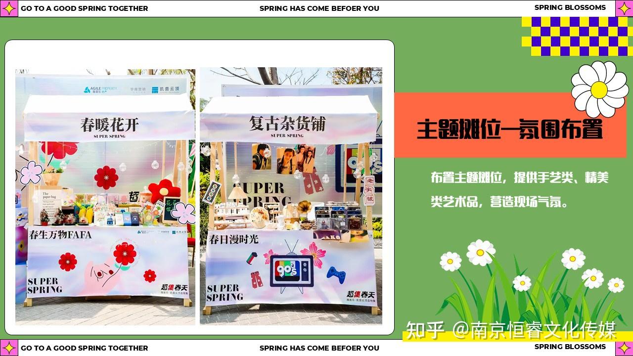 主題攤位增添特色:布置主題攤位,這些攤位售賣或展示手藝類、精美類藝術(shù)品。攤位的設(shè)計(jì)也會(huì)圍繞春天的主題,營造出獨(dú)特的氛圍,讓大家在購物或參觀的同時(shí),仿佛置身于一個(gè)充滿藝術(shù)氣息的春日集市。