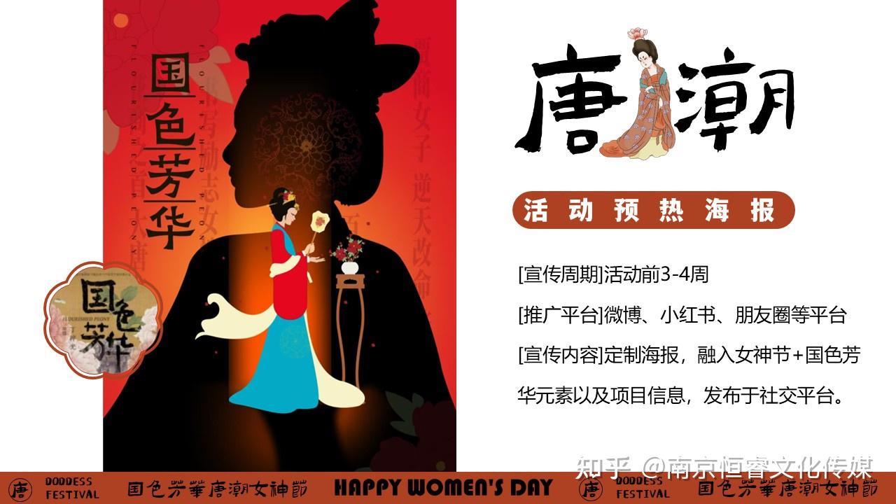 借勢熱度,打造專屬活動:近期爆火的《國色芳華》展現(xiàn)了盛唐文化與女性力量,本次活動借勢該劇熱度,以年輕化視角定制女神節(jié)專屬活動。活動時間為 3 月 6 日 - 3 月 10 日,地點(diǎn)選在地產(chǎn)、商業(yè)中心或文旅景區(qū),為大家打造一場沉浸式的唐潮盛宴。