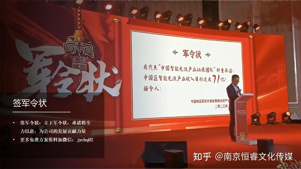 簽軍令狀(16:00 - 16:10):各團(tuán)隊(duì)代表上臺(tái)簽署軍令狀,立下軍令狀,承諾將全力以赴,為公司的發(fā)展貢獻(xiàn)力量。簽軍令狀是一種莊重的承諾,象征著團(tuán)隊(duì)的決心和勇氣,讓員工們深刻認(rèn)識(shí)到自己肩負(fù)的責(zé)任,激發(fā)大家的斗志,確保開(kāi)門(mén)紅目標(biāo)的實(shí)現(xiàn)。